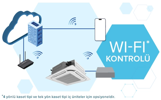 Duvar tipi, kanal tipi ve konsol tipi cihazlarda standart olarak sunulan Wi-Fi, 4 yönlü ve tek yön kaset tiplerinde opsiyoneldir.