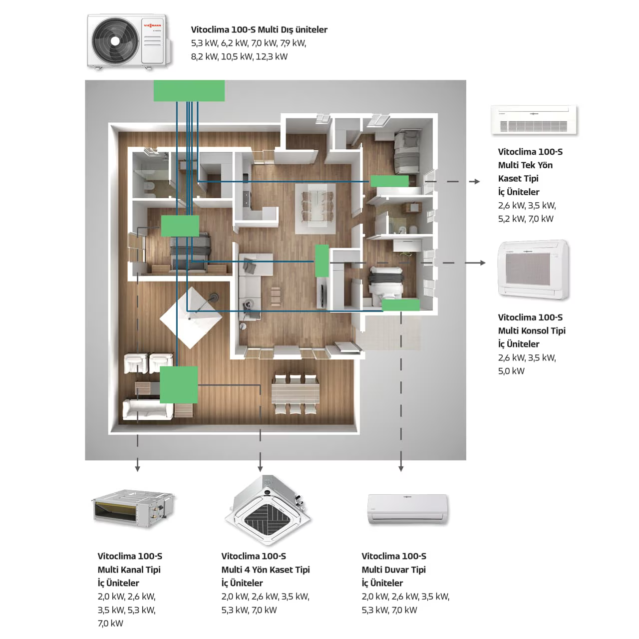 Vitoclima 300-S geniş iç ünite seçenekleri ile her türlü uygulama için kullanılabilir.